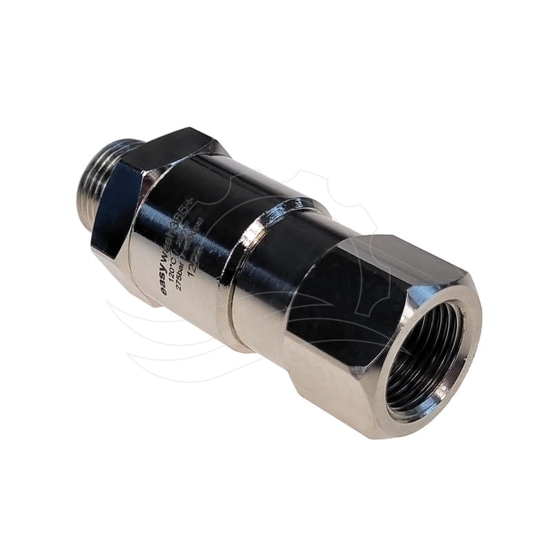 Easywash365+ straight swivel connector G1/4''F-G3/8''M. Stainless steel and nickel-plated brass housing. Stainless steel shaft with a 6mm flow diameter. Max pressure 275 bar, max temperature 120°C.
