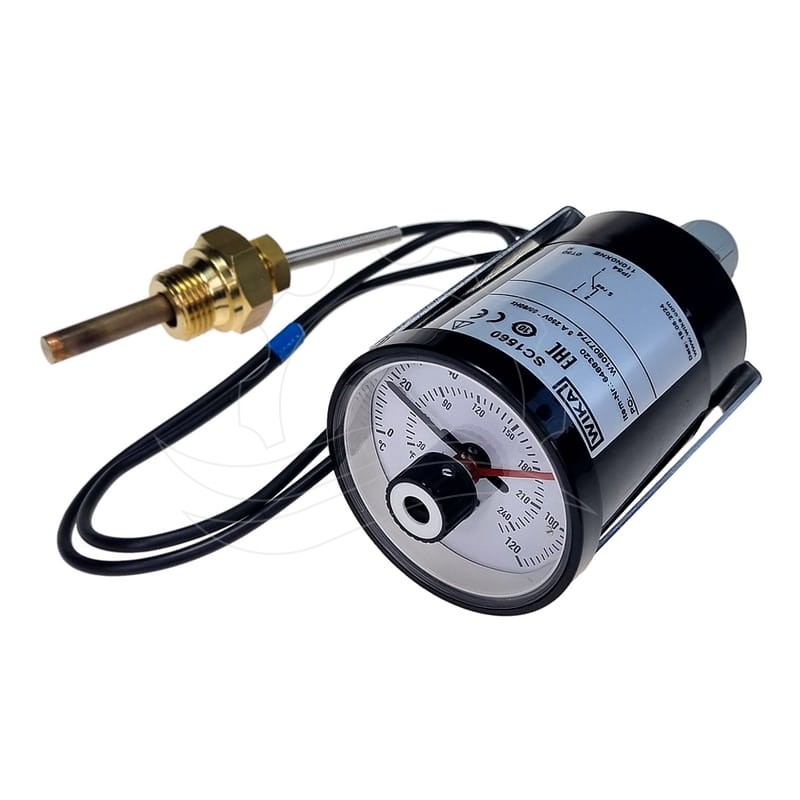The 0-120°C glycol thermostat (with red indicator) is primarily used to regulate the temperature of the floor heating system in Ehrle car washes. In the SmartWash model, it is used to regulate the boiler water temperature.