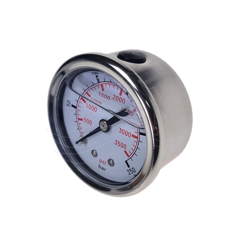 Glycerin pressure gauge with stainless steel housing. Diameter 50mm, operating range 0 to 250bar, 1/4" threaded connection on the rear.