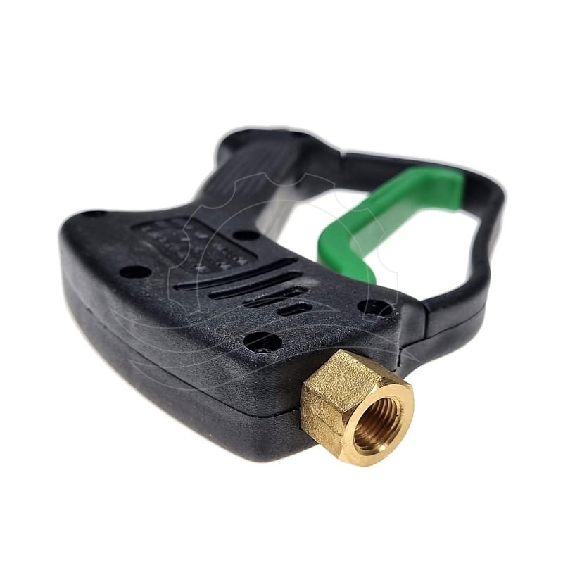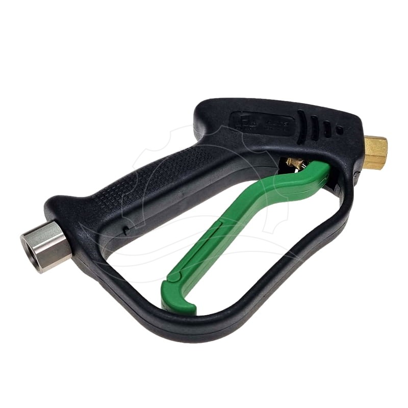 The Aura gun from the Italian manufacturer MTM Hydro. The gun is equipped with a relief valve that opens only at low pressure and remains closed when operating at high pressure. The gun has a G3/8"F swivel connector on the hose side and a G1/4"F port on the lance side. This Aura gun model was often found in Ehrle car washes. It was discontinued in 2024. Instead, we recommend the Tecomec MV925 gun, which has the same parameters (LG-005).